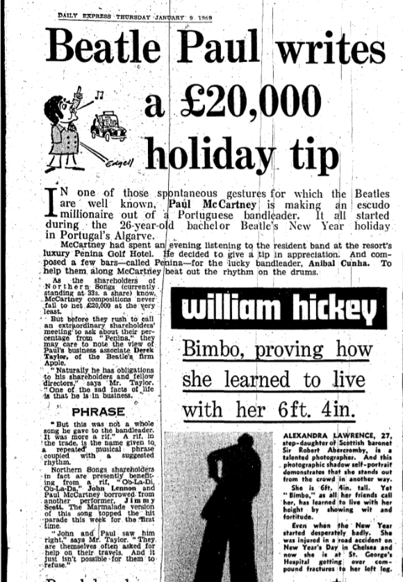 Almost fifty years have passed, and we’re still unsure of how the Beatles’ ditty “Suzy Parker” came about. But the origin story for “Penina” — discussed and introduced by Paul McCartney a few hours after the somewhat mysterious performance of “Suzy Parker” — quite literally appeared in print on the very day we’re discussing, January 9, 1969, in the Daily Express.
