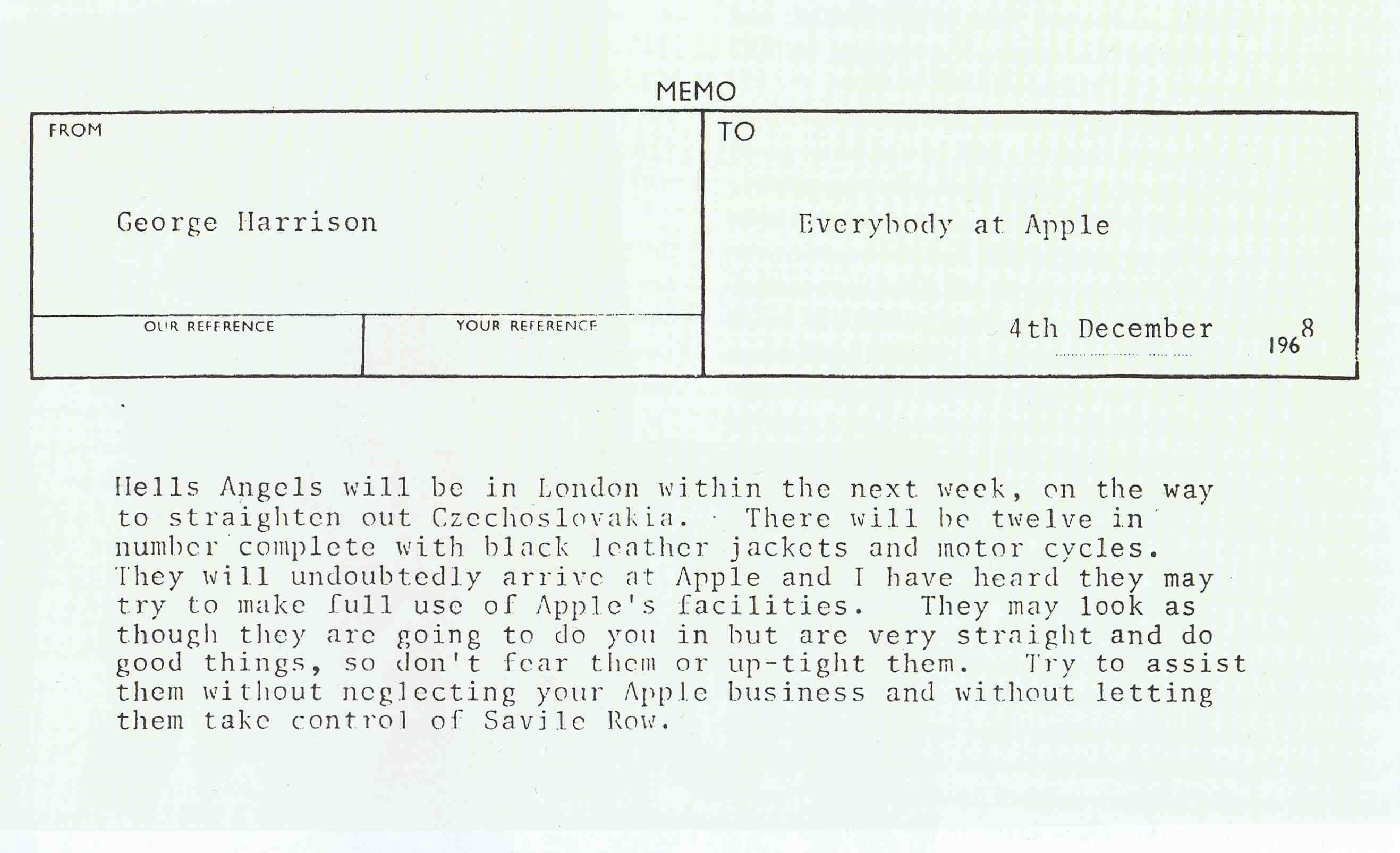 Hells Angels will be in London within the next week, on the way to straighten out Czechoslovakia. There will be twelve in number complete with black leather jackets and motor cycles. They will undoubtedly arrive at Apple and I have heard they may try to make full use of Apple’s facilities. They may look as though they are going to do you in but are very straight and do good things, so don’t fear them or up-tight them. Try to assist them without neglecting your Apple business and without letting them take control of Savile Row.