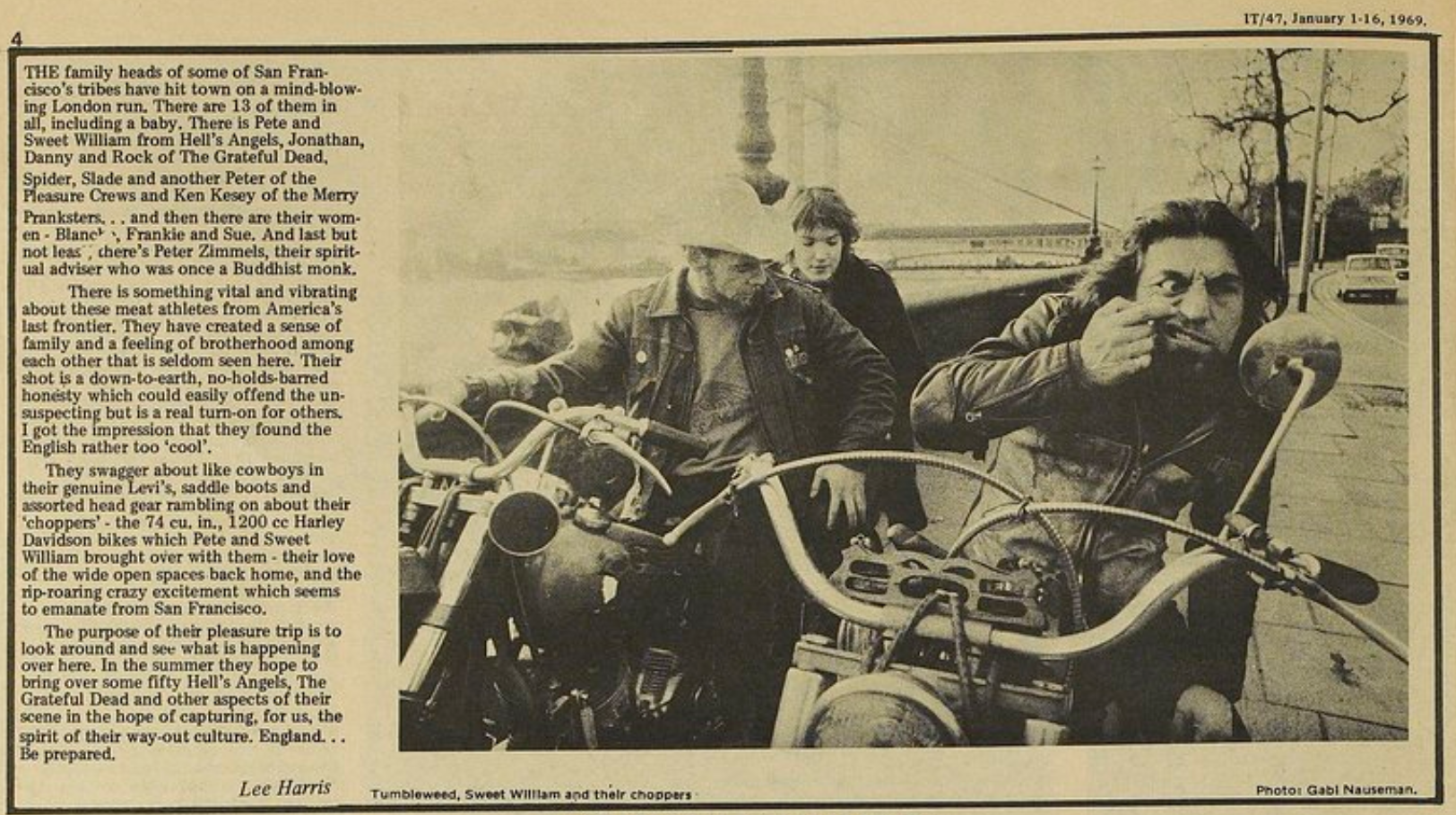 The International Times reports on the Hell’s Angels’ arrival in England in its January 1-16, 1969 issue.