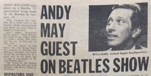 Both the Cavern and Andy Williams speculation were laid to rest at by the end of the month, when the January Beatles Book magazine hit mailboxes, saying “Rumours that the programme might be made in Liverpool instead of London have been denied. So has the idea that Andy Williams, who lunched with Apple executives a few weeks ago, might make a guest appearance in the show.