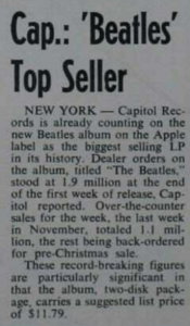 Whether it was an imposter like the Moles, or imitators covering Beatles tracks, nothing beat the real thing. In the December 14, 1968, issue of Billboard, Capital Records said the White Album was in line to become their biggest record in the label’s history. After just one week, dealer orders already stood at 1.9 million while over-the-counter sales totaled 1.1 million.