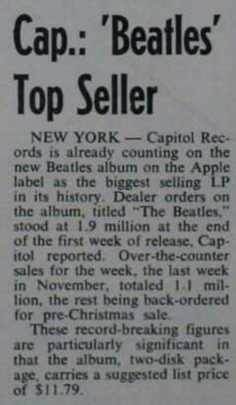 Whether it was an imposter like the Moles, or imitators covering Beatles tracks, nothing beat the real thing. In the December 14, 1968, issue of Billboard, Capital Records said the White Album was in line to become their biggest record in the label’s history. After just one week, dealer orders already stood at 1.9 million while over-the-counter sales totaled 1.1 million.