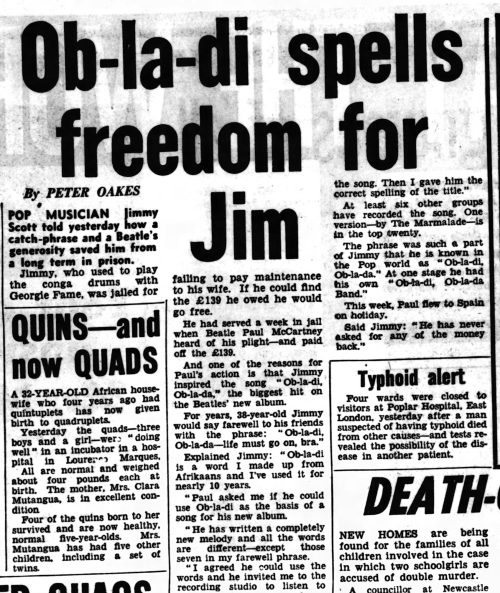 Explained Jimmy: “Ob-la-di is a word I made up from Afrikaans and I’ve used it for nearly 10 years. “Paul asked me if he could use Ob-la-di as the basis of a song for his new album. “He has written a completely new melody and all the words are different—except those seven in my farewell phrase.