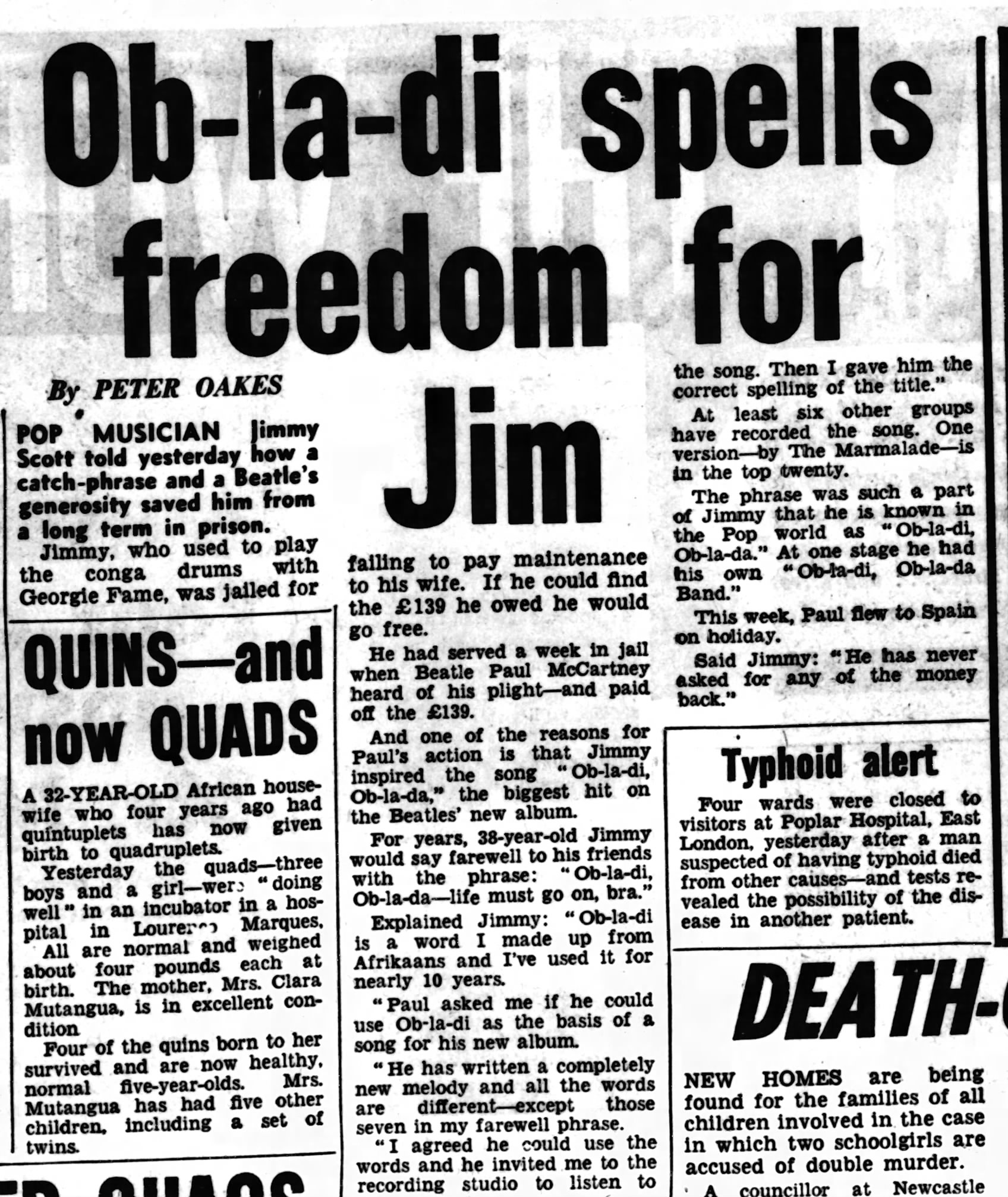 On this December 15, 1968, Jimmy Scott earned a small feature in the Sunday People newspaper. This obscure interview presents several insights that challenge today’s established wisdom about “Ob-La-Di, Ob-La-Da.” But first, a little of what we’ve been led to believe. Stick with me, I’ll get back to this interview, and December 15, 1968, soon.