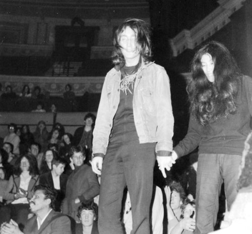 Finally, John Lennon and Yoko Ono came out in black robes and disappeared under a white-sheet sacking. Nothing happened. Simplicity was having its day. Another Void. Another filling up. Every fourth member of the audience had his say, a mass hysteria of John Lennon jokes. Then a lousy poet read some lousy poetry. In the midst of all this, the glorious moment of the evening occurred. Someone bound in a white sheet threw himself off the stage into the pit. Finally we were not being conned. It seemed a pure act of madness. It was savage tortured meat hurling itself among the vague love children transfixing each other on a spread of cloth. Perhaps. Only Perhaps.