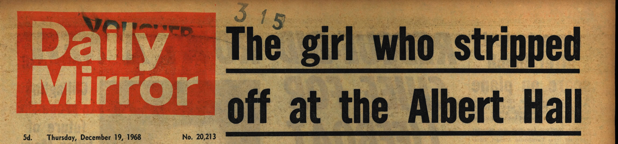 From the front page of the December 19, 1968, Daily Mirror, under the headline “The girl who stripped off at the Albert Hall: Police called to a ‘happening’ in the audience”:
