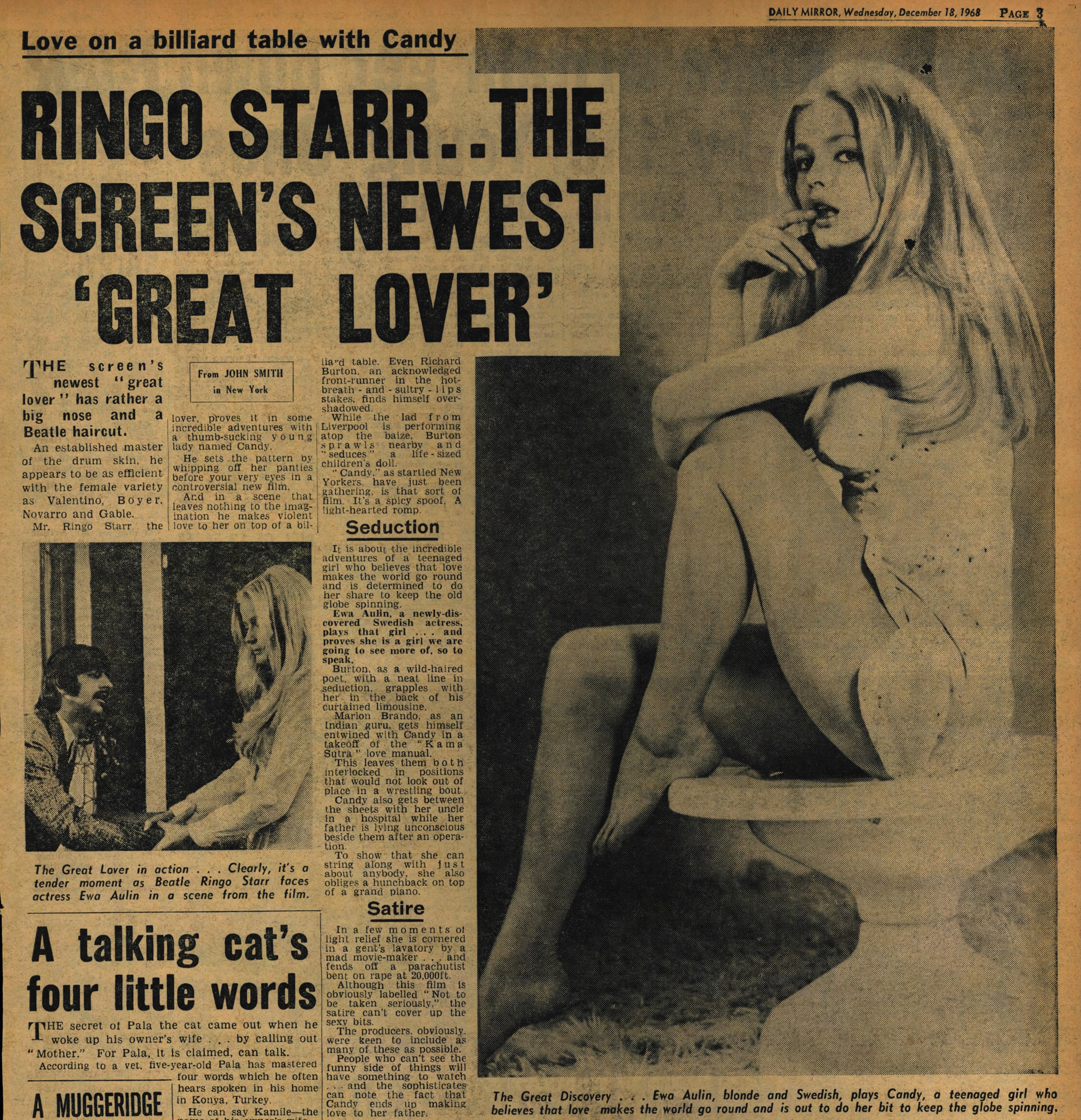 The feature reviewed “Candy,” which enjoyed its world premiere the day before (see the last entry), and hyped our drummer as someone “as efficient with the female variety as Valentino, Boyer, Novarro and Gable.”