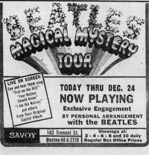 Magical Mystery Tour, meanwhile just finished a brief run at a Boston theater, one of just a couple American showings of the film late in 1968 — it wasn’t broadcast on American TV. It wouldn’t see a widespread cinematic release in the country until 1974.