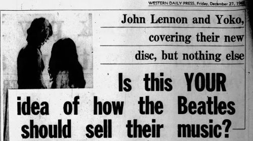 Apple publicist Derek Taylor was sick of censorship, “fed up with all the humbug in this country.” A story in the December 27, 1968, Western Daily Press retold the familiar Two Virgins story – John and Yoko are naked on the cover, few are selling the record, few are buying the record and no one is listening to the record.