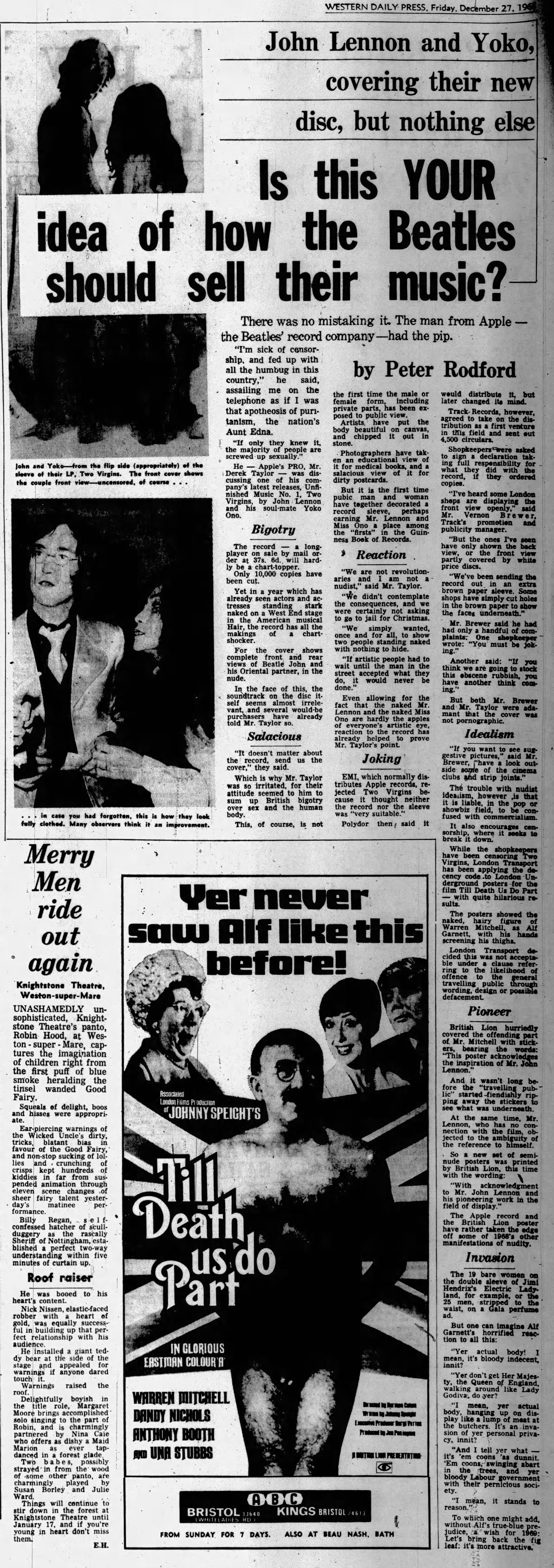 Apple publicist Derek Taylor was sick of censorship, “fed up with all the humbug in this country.” A story in the December 27, 1968, Western Daily Press retold the familiar Two Virgins story – John and Yoko are naked on the cover, few are selling the record, few are buying the record and no one is listening to the record.