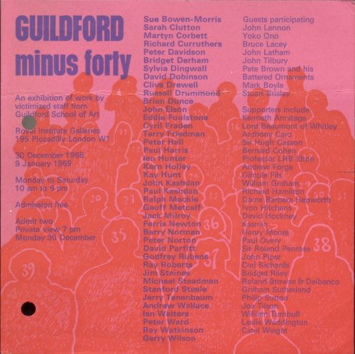 John Lennon and Yoko Ono made a brief appearance at the Royal Institute Galleries in Piccadilly on December 30, 1968, by invitation of 40 teachers who had been fired by the Guildford School of Art. The occasion was the “Guildford Minus Forty” exhibition, in support of the terminated staff.