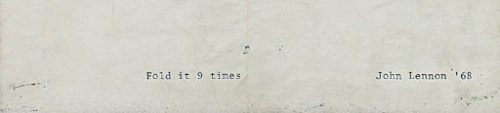 Opening the exhibition, John and Yoko handed out “quarto-sized” papers with the simple instruction: “Fold it nine times – John Lennon, 1968.”