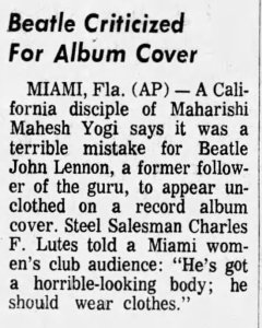 John Lennon, who was officially divorced for about a month, wasn’t so coy. Naked on record racks since November 1968 — more in theory than in practice, since the record wasn’t easy to purchase — John and girlfriend Yoko Ono were as public a thing as possible. For all the commentary and protest of the Two Virgins cover, one that was published in American papers this week was perhaps a low blow, when a former disciple of the Maharishi objected to John’s depiction because “he’s got a horrible-looking body.” His body of work was set to expand — he’d rehearse for an imminent performance on the Rock and Roll Circus the following day.