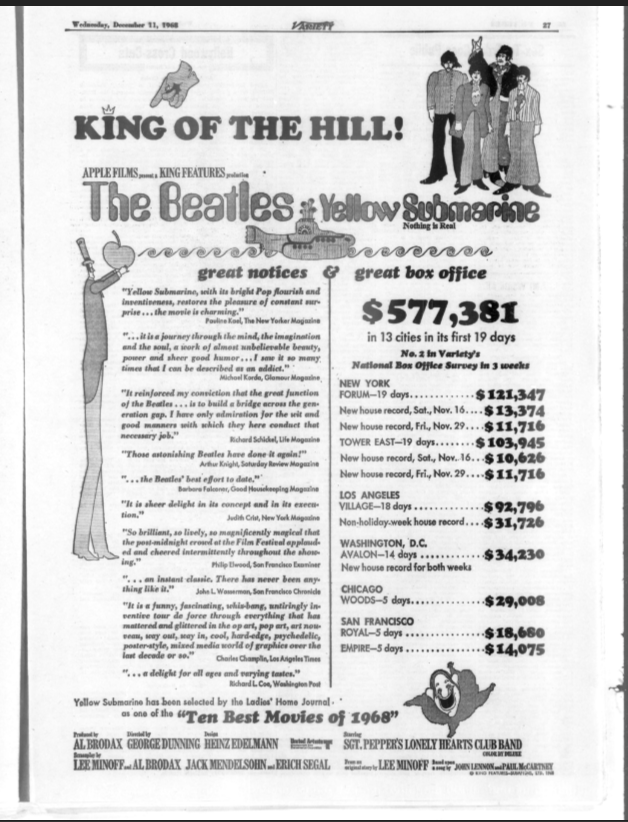 It wasn’t just on vinyl — the Beatles dominated as true kings of all media. Yellow Submarine, out since the summer in the UK but in US theaters for only a few weeks, had established its reputation as a clear-cut critical and commercial smash. Even in the world of print, the Beatles were easily accessible with Hunter Davies’ authorized biography flying off shelves since its release in October.