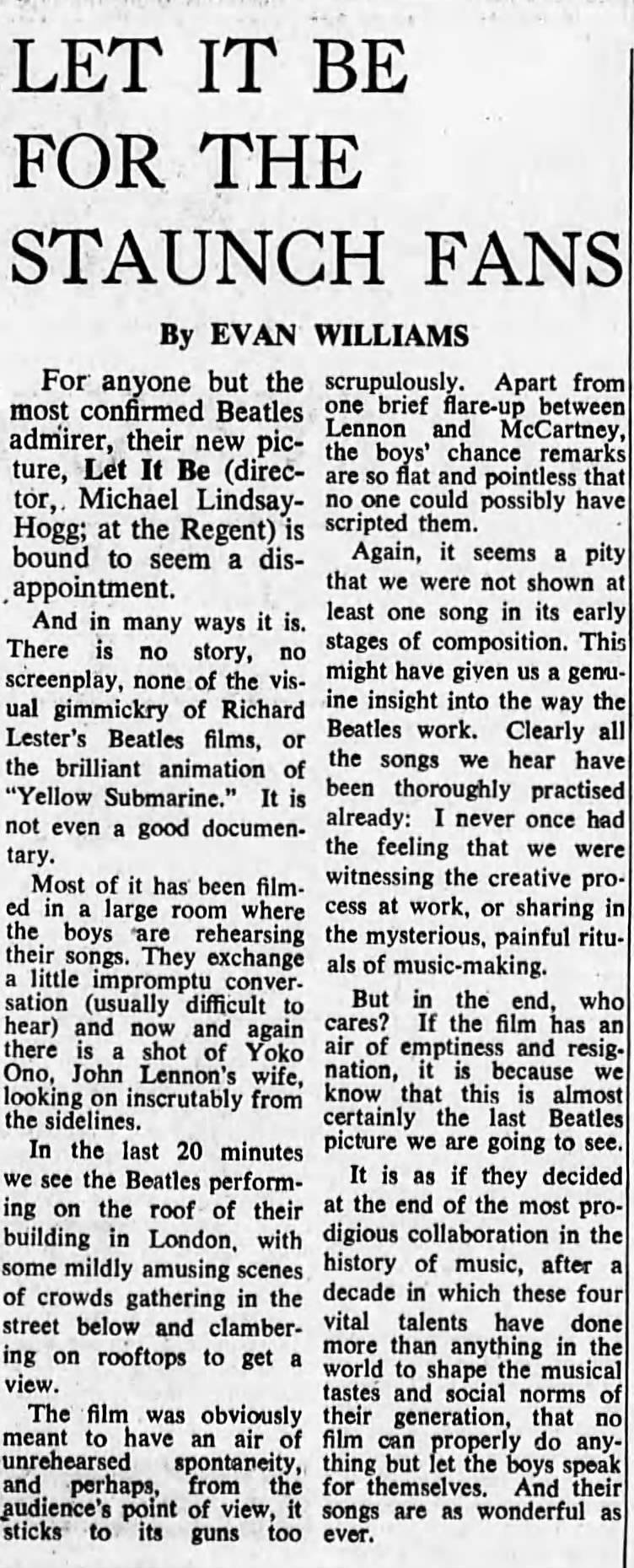 On the very eve of the Let It Be’s ultimate release in May, we can catch a glimpse of contemporary opinions of the film.