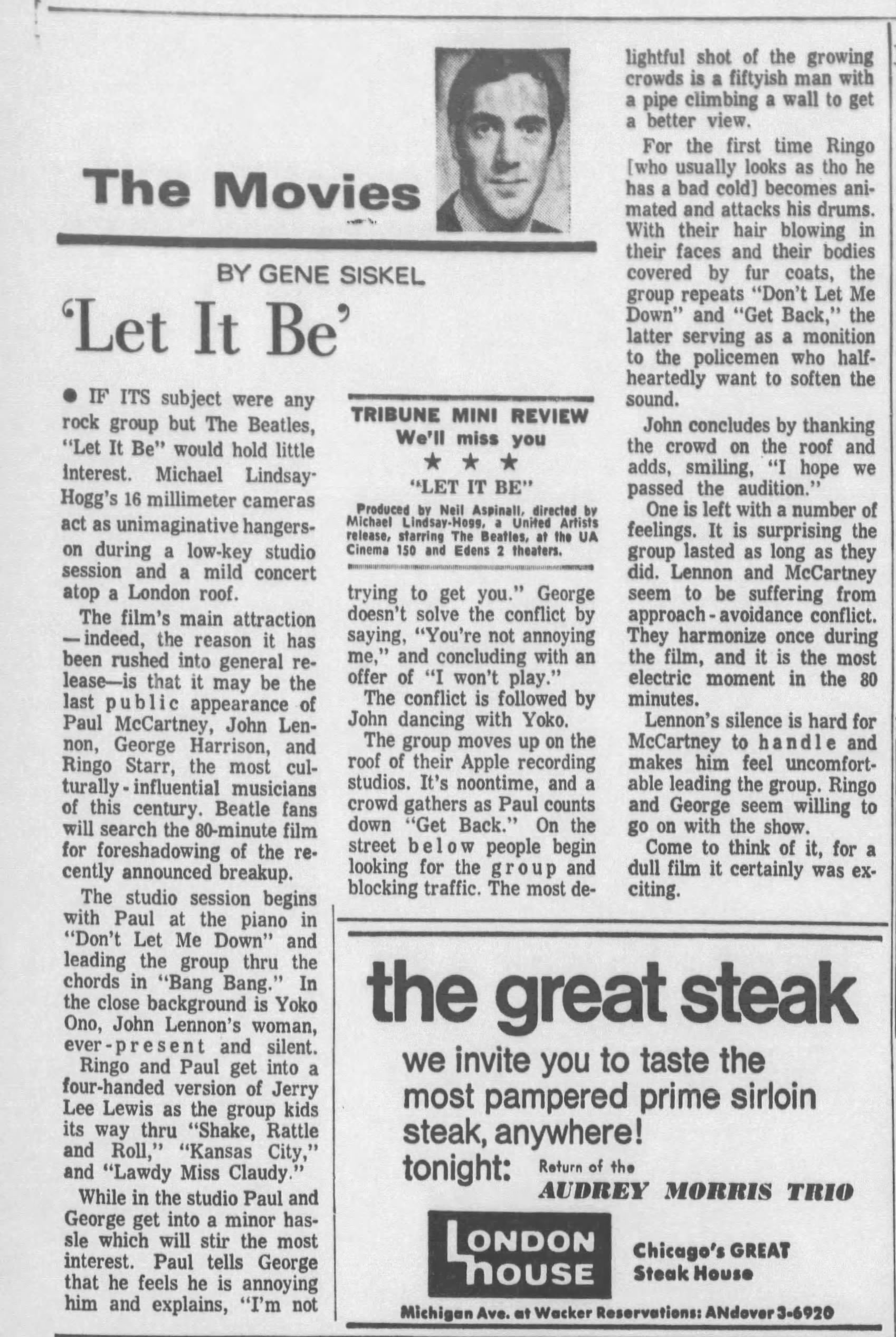 Chicago Tribune legend Gene Siskel gave Let It Be three stars, writing “Beatle fans will search the 80-miunte film for foreshadowing of the recently announced breakup.”