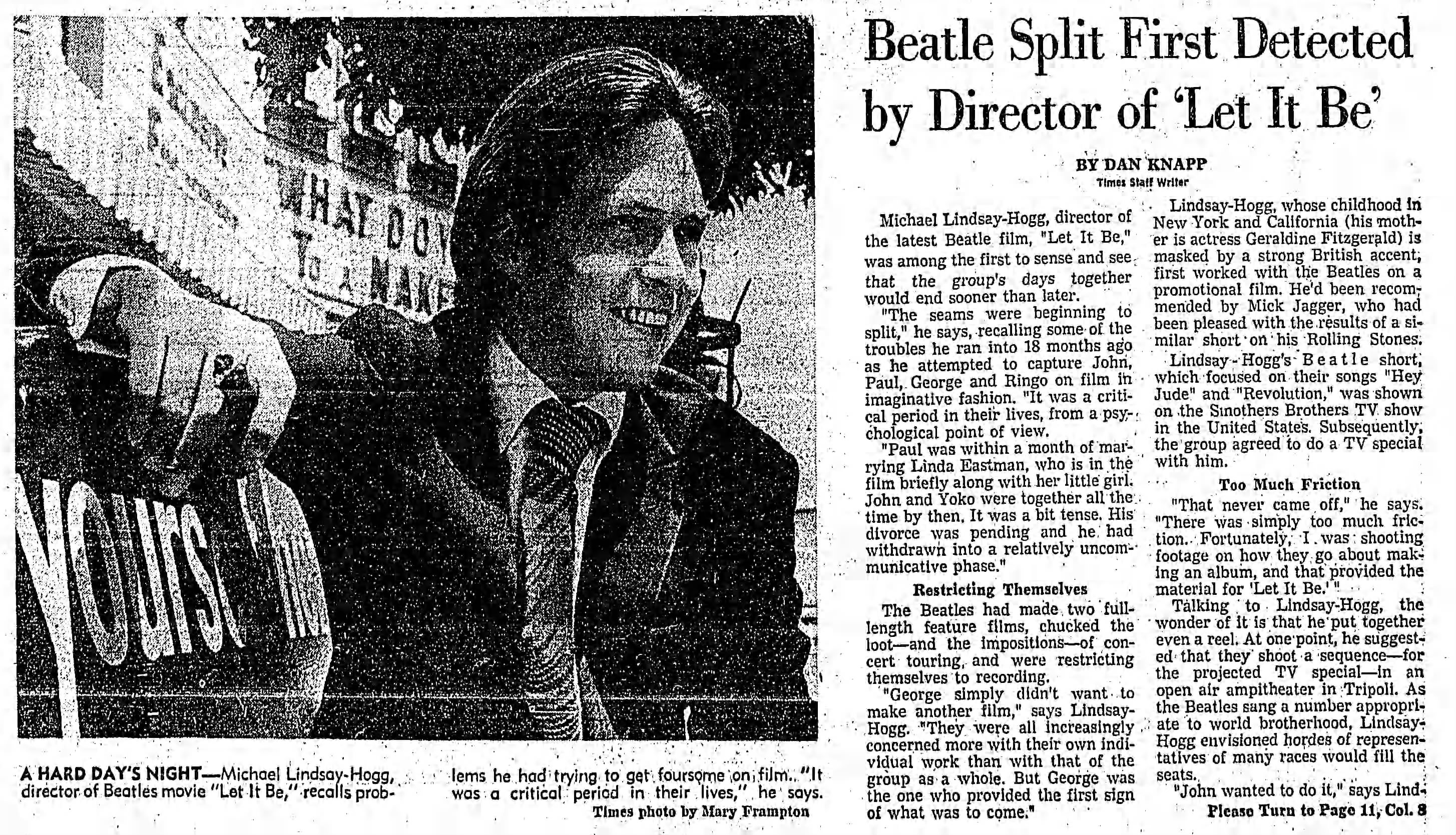 That’s director Michael Lindsay-Hogg, quoted in a syndicated wire story the week of the film’s release, ostensibly to promote the film. We’ll never know if he’d have said the same thing if the film come out in sometime in 1969 as originally planned, when it was provisionally titled Get Back.