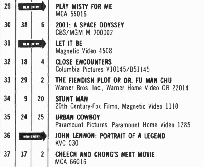 In July 1981, a decade after it was in theaters, Let It Be saw its first home release on VHS (it was later issued on Laserdisc). Again using Variety’s rankings, the tape debuted at No. 31 and kind of bubbled around the 20s, peaking at No. 19 before eventually falling out of the Top 40.