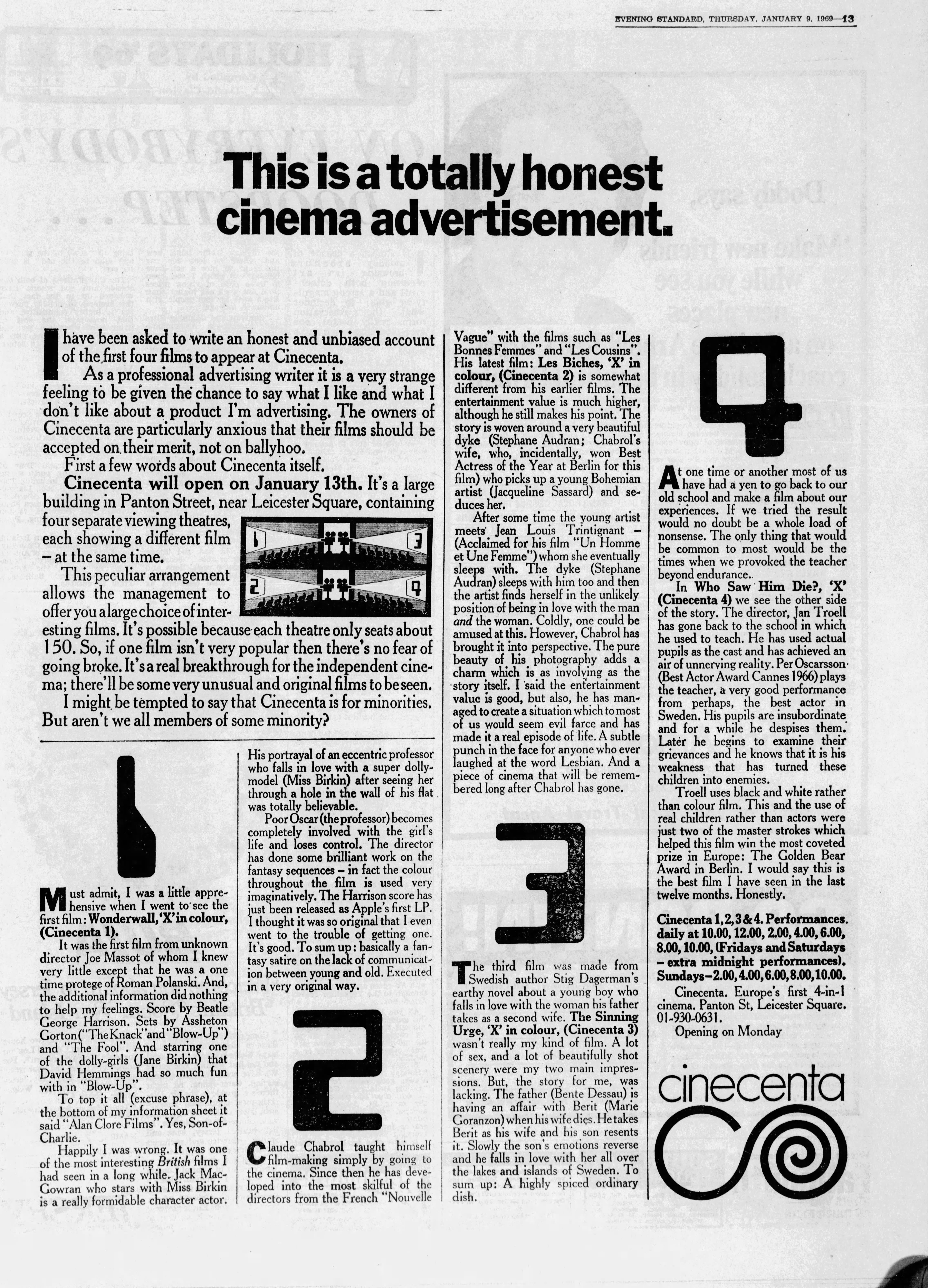 “This peculiar arrangement allows the management to offer you a large choice of interesting films” (from a January 9, 1969, ad for Cinecenta)
