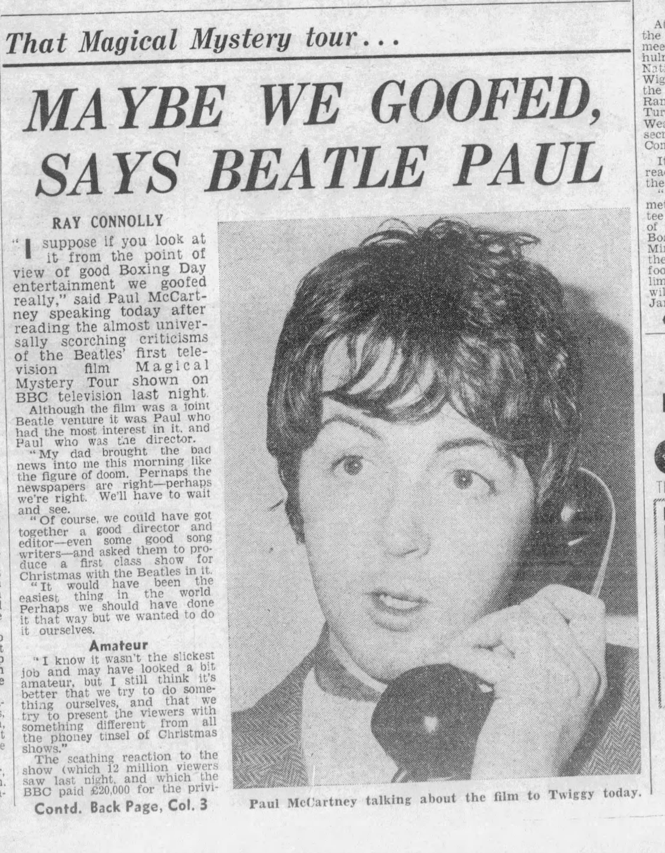 SM: “Magical Mystery Tour” is mostly shot on location. And I think they even tried to film some scenes at Twickenham, but it was all booked up. And that’s why they used that big Air Force hangar, because they couldn’t get into one of the film studios at the last minute.
