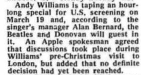 While Andy Williams featured a Beatles number in the dizzying opening sequence and was presently rumored to be in line to host the band on his TV show in the coming months (see the adjacent clipping from NME), the American crooner wasn’t discussed at all on the Nagra tapes the next morning.